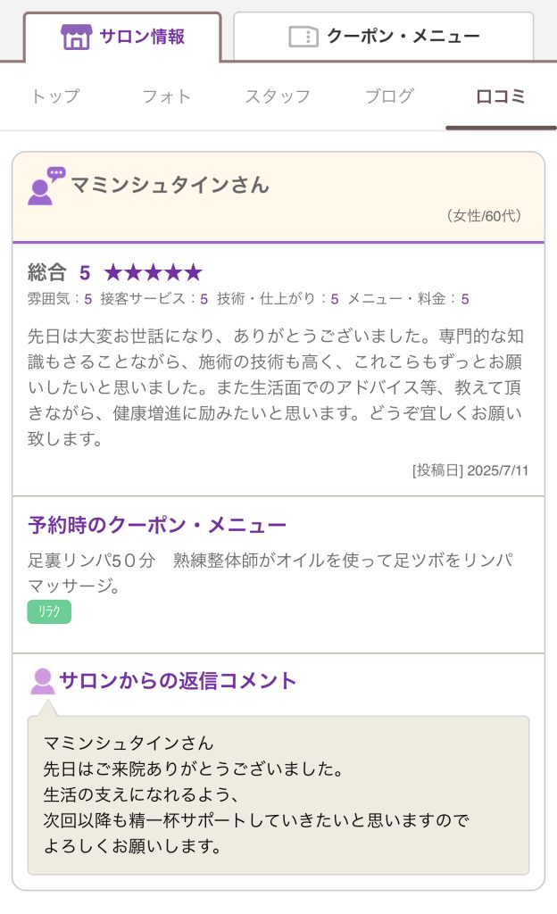 スタッフの皆さんの雰囲気も明るく、施術後は身も心も軽くなっていることを実感するので通っています